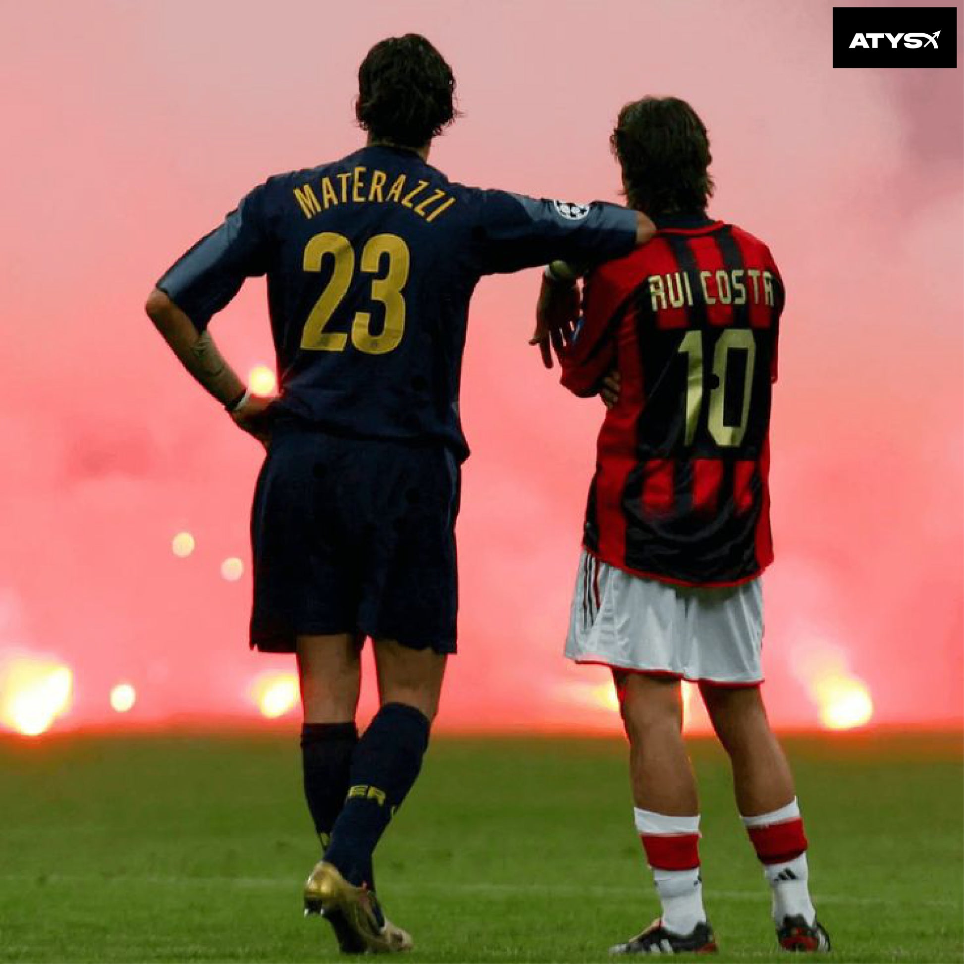 Ce sweat à capuche AtysX rend hommage à l’un des moments les plus puissants du football moderne — Materazzi et Rui Costa, côte à côte dans la fumée du Derby della Madonnina 2005.